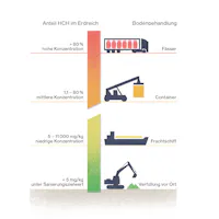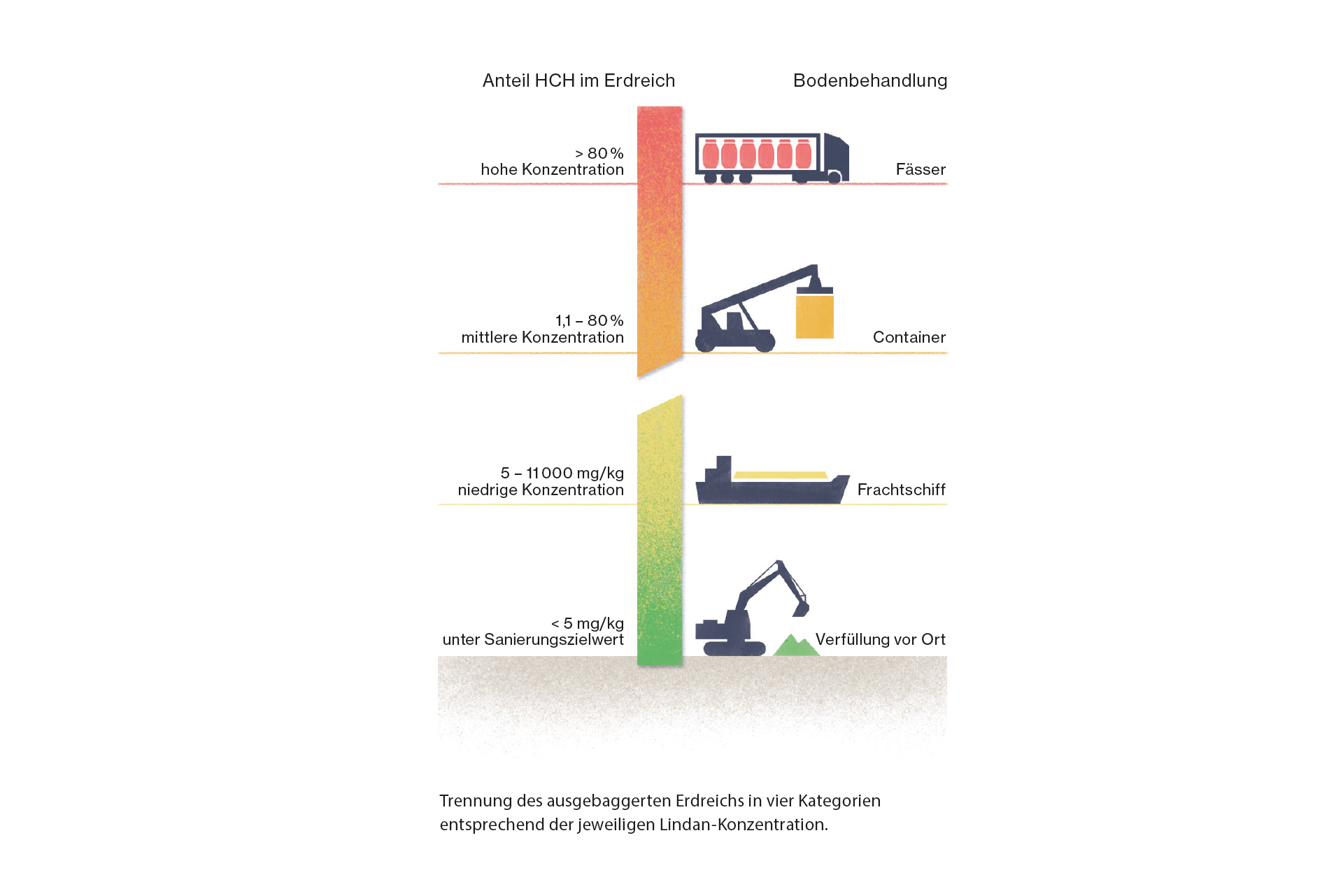 – Abfall mit einer mittleren HCH-Konzentration behandelte man mittels thermischer Desorption. Bei dieser Technologie wird die Volatilität von Schadstoffen durch Hitzeeinwirkung gesteigert, sodass diese vom Erdreich getrennt werden können. Die Schadstoffe werden danach in einer Abgasbehandlungsanlage gesammelt.