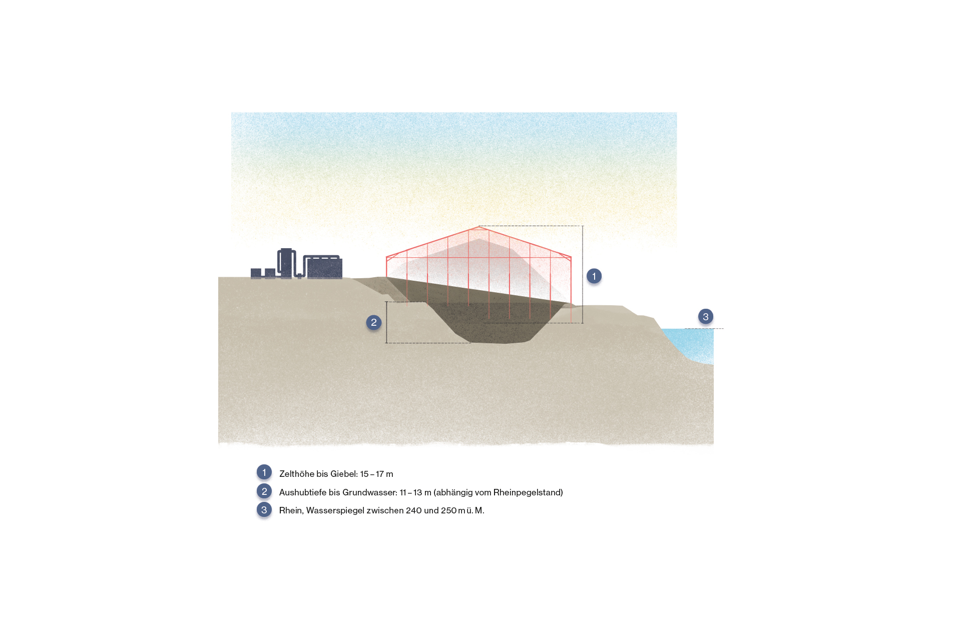 Weitere Vorsichtsmassnahmen wurden auch in den Zelten getroffen: Da Benzol ein leichtflüchtiger Stoff ist, wurden auch direkt an den Baggern Luftabsauganlagen mit Kohlefiltern installiert. Diese saugten Benzol direkt an der Quelle ab, sobald das Erdreich bewegt wurde. In heissen Sommerphasen stieg die Temperatur in den Zelten manchmal bis auf 60 °C an, sodass HCH und andere Verbindungen verdampften und die Kohlefilter überlasteten. Um das Problem mit der Verdampfung in den Griff zu bekommen, kühlte man die Luft in den Zelten mit Grundwasser, damit das HCH und das TCB kondensieren und in flüssiger Form als Sondermüll entsorgt werden konnten. Die Abluftemissionen der Kohlefilter wurden mithilfe eines Gas-Chromatografen ständig überwacht. Zudem wurde ein Frühwarnsystem eingerichtet, um zu erkennen, wenn die Behandlung nicht mehr ausreichend wirksam war, beispielsweise bei gesättigten Kohlefiltern. So konnten rechtzeitig geeignete Gegenmassnahmen getroffen werden.