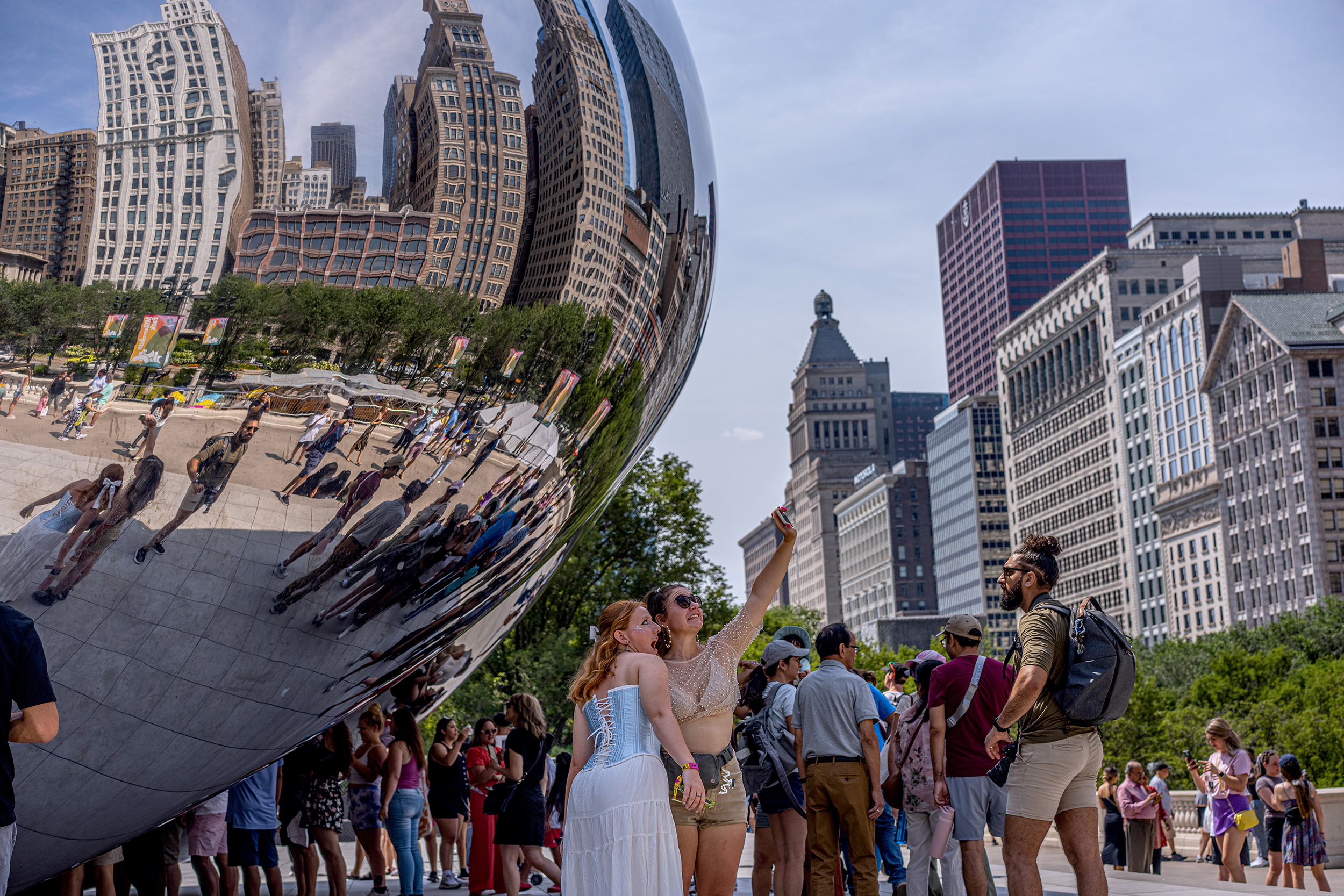 Die ikonische Skulptur «Cloud Gate» von Anish Kapoor in der Innenstadt von Chicago. Hunderttausende von Touristen besuchen das Kunstwerk jedes Jahr. Es befindet sich im wohlhabenden Chicagoer Stadtteil Loop mit seiner beeindruckenden Skyline.