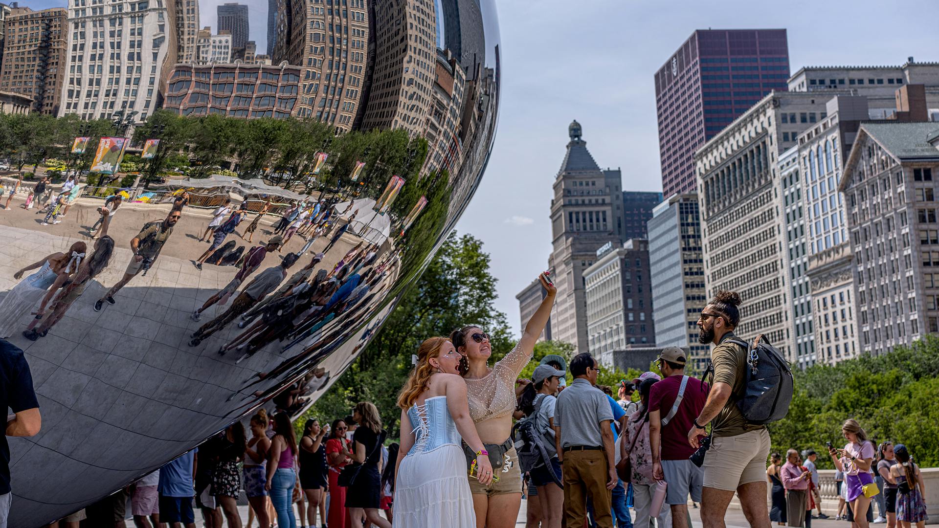 Die ikonische Skulptur «Cloud Gate» von Anish Kapoor in der Innenstadt von Chicago. Hunderttausende von Touristen besuchen das Kunstwerk jedes Jahr. Es befindet sich im wohlhabenden Chicagoer Stadtteil Loop mit seiner beeindruckenden Skyline.