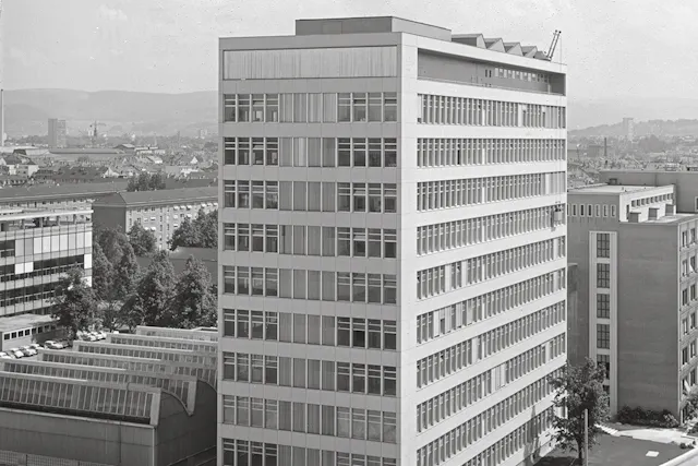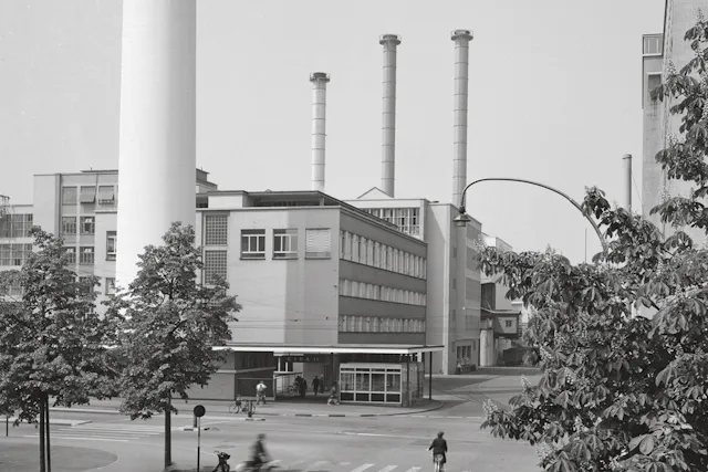 ...and in an early photograph. For decades, formulations for the textile industry were developed and tested in this Ciba building.