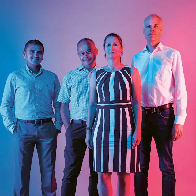 Mithun Ratnakumar, engineer; Norbert Lauber, Team Head PDD2; Sonja Lederhilger, engineer; Dominik Ziegler, Global Head of Packaging and Medical Device Development.