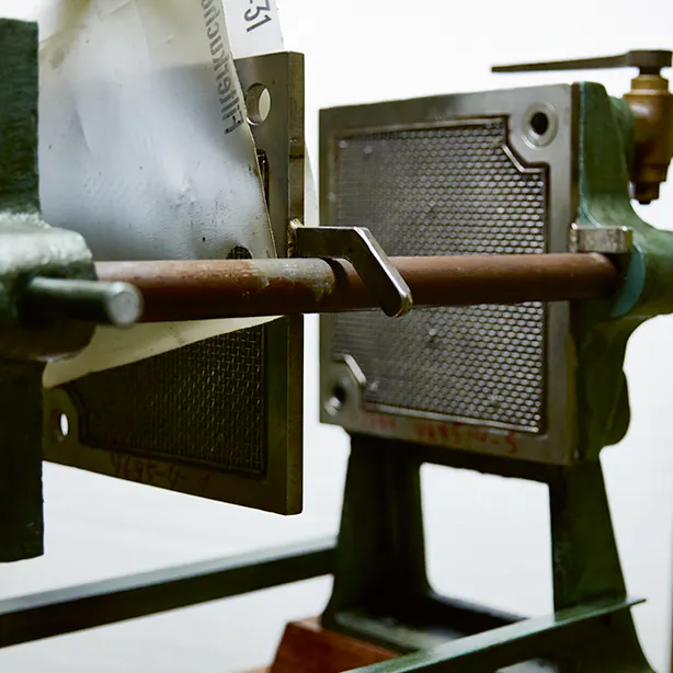 Filter presses played an important role in the everyday professional life of Theodor Grauer. They were used for the solid-liquid separation of suspensions: “You would let a mixture of substances (suspension) flow into the cloth-lined chambers where they were placed under high pressure. The liquid passed through the filter medium and exited the press via outlet channels. The filter cake fell into the wooden boxes placed under the press and was dried. This, in simple terms, is how dyes were created,” explains Theodor Grauer. Today, he adds, this procedure is of course obsolete.