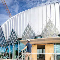 The innovative solar LED elements of the media façade also have inbuilt flexibility to reflect material movement and building tolerances. “The supporting structure on the roof is highly complex because it has to mimic the shape of the building. The outside is convex, as is the transition from the vertical to the sloped surface. The inside, on the other hand, is concave, but the transition from the vertical to the inclined surface is convex,” explains Christian Reimann from iart, who is responsible for the media façade.