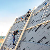 The protection of the workers is given the utmost attention. When I first arrived at the site, I observed four high-altitude workers putting on special protective equipment to attach the prefabricated solar LED elements to the sheet metal roof.