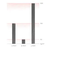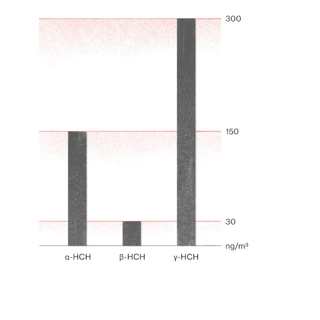 Threshold levels were specified for each of the three main isomers (α-, β- and γ-HCH), based on their different toxicological properties. An action plan was set up to cover events that exceeded the threshold. The plan specified three different levels of action: green (continue work), amber (implement corrective action) and red (stop work, review the situation and implement corrective action). This action plan was applied to the results of daily monitoring as well as to weekly average monitoring and annual monitoring. TCB levels were also monitored.